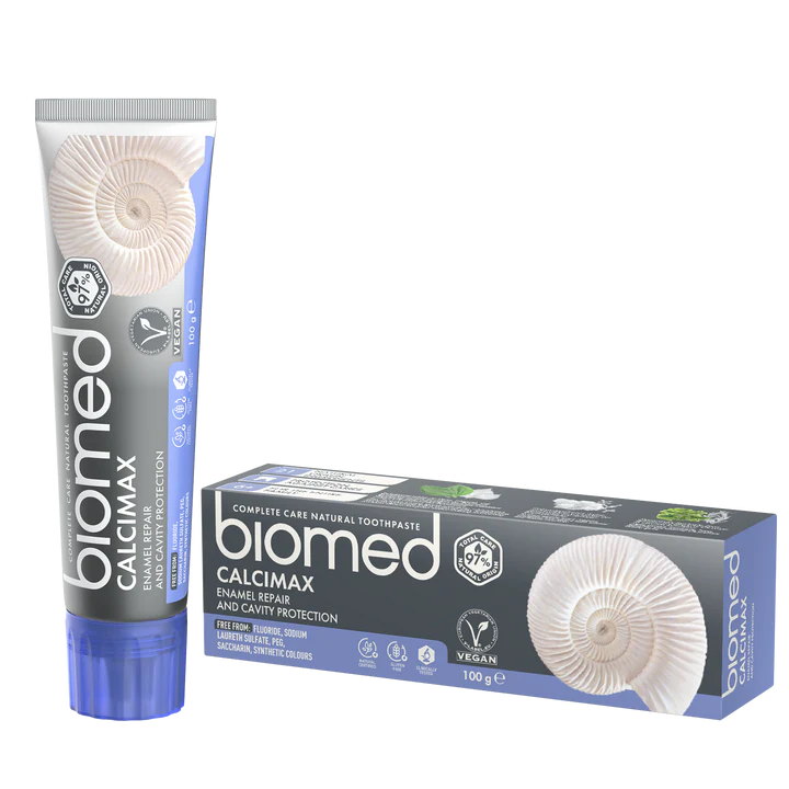 BIOMED Calcimax 97 % tandkräm för emaljåterställning 100 g Emaljåterställning och kariesförebyggande | Vegansk, utan SLES NATURLIGT URSPRUNG GLUTEN-FRI VEGAN VETENSKAPLIGT TESTAD BIOMED Calcimax Naturlig tandkräm som innehåller kalcium, magnesium, zinkhydroxiapatit, L-arginin och en unik blandning av över 12 aktiva naturliga komponenter som stärker tandemaljen och förebygger karies. 97 % av ingredienserna i vår tandkräm…
