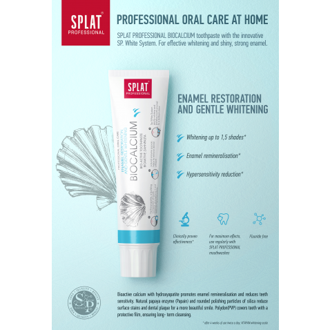 SPLAT® PROFESSIONAL BIOCALCIUM® är en tandkräm med bioaktivt kalcium från äggskal som bidrar till remineralisering av emaljen. Det innovativa Sp.White System polerar emaljen till en strålande glans och främjar munhälsan – naturligt papayaenzym (papain) och rundade polerande partiklar av kiseldioxid hjälper till att ta bort ytliga fläckar och tandplack, Polydon (PVP) – filmbildande komponent – täcker tänderna med en skyddande film, vilket effektivt bidrar till långvarig rengöring. Överkänslighet. Aktivt kalcium stärker emaljen.