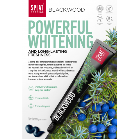 SPLAT SPECIAL BLACKWOOD WHITENING TOOTHPASTE – speciellt för dem som inte är rädda för mörkret. Vår BLACKWOOD-tandkräm hjälper till att ta bort tandplack. Träkol, som ger BLACKWOOD® sin svarta färg, vitgör emaljen effektivt tillsammans med rundade polerande partiklar av kiseldioxid. Enbärextrakt främjar tandköttets hälsa, medan fuktgivande maltooligosylglukosid har en lugnande effekt på tandköttet. Den aktiva ingrediensen Biosol ger frisk andedräkt, liksom mentol. Steviaextrakt (naturligt sötningsmedel) vårdar mjuka munnvävnader och främjar tandköttets hälsa.