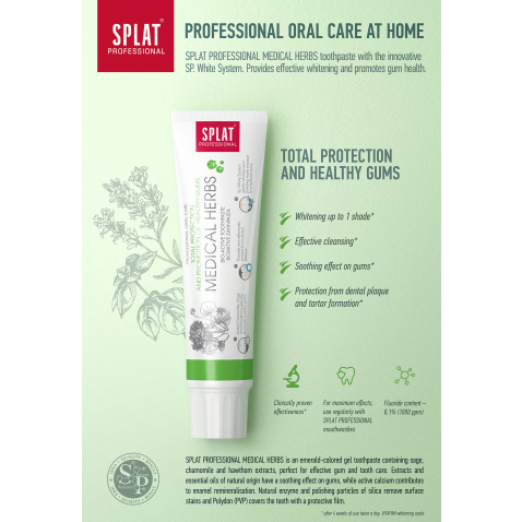 SPLAT PROFESSIONAL MEDICAL HERBS är en smaragdgrön gel-tandkräm som innehåller extrakt av salvia, kamomill och hagtorn för effektiv tand- och tandköttsvård. Kalcium från äggskal bidrar till remineralisering av emaljen. Hagtornblomsextrakt (Crataegus Monogyna Flower Extract) och eterisk olja av pelargon (Pelargonium Graveolens Stem Leaf Oil) har en lugnande effekt på tandköttet.