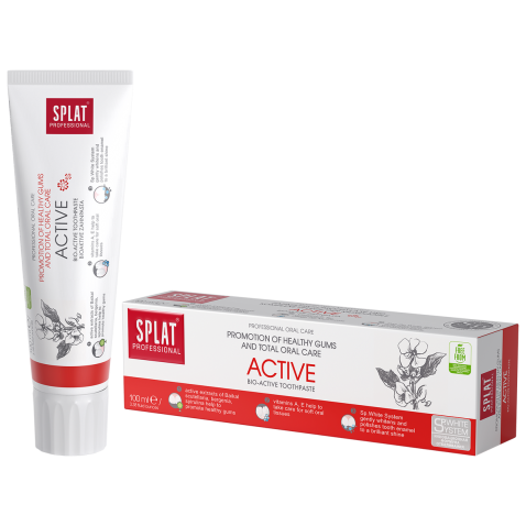 SPLAT PROFESSIONAL ACTIVE är en speciell mörk tandkräm med aktiva extrakt av Baikal Skullcap, Bergenia och Spirulina. Baikal skullcap (Scutellaria Baicalensis Root Extract) hjälper till att förebygga bildandet av tandplack. Extrakt av tång (Spirulina Platensis) och essentiell olja av solros har en lugnande effekt på tandköttet. Retinylpalmitat (vitamin A) och tokoferylacetat (vitamin E) hjälper till att vårda mjuka munnvävnader.