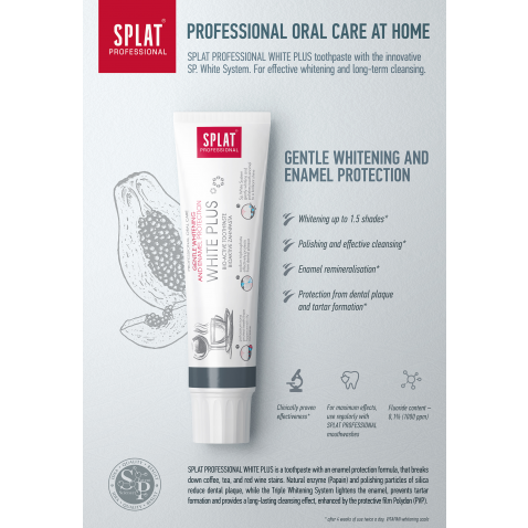 SPLAT PROFESSIONAL WHITE PLUS är en tandkräm med vårt blekande Sp. White System®, som polerar emaljen till en strålande glans – naturligt papayaenzym (papain) och rundade polerande partiklar av kiseldioxid hjälper till att ta bort ytliga fläckar och tandplack, Polydon (PVP) – filmbildande komponent, täcker tänderna med en skyddande film, vilket effektivt bidrar till långvarig rengöring. Tripple Whitening System (System of Triple Action Phosphate) bryter ner fläckar från kaffe, te och rött vin som påverkar tändernas färg och polerar tandemaljen på ett skonsamt sätt:
