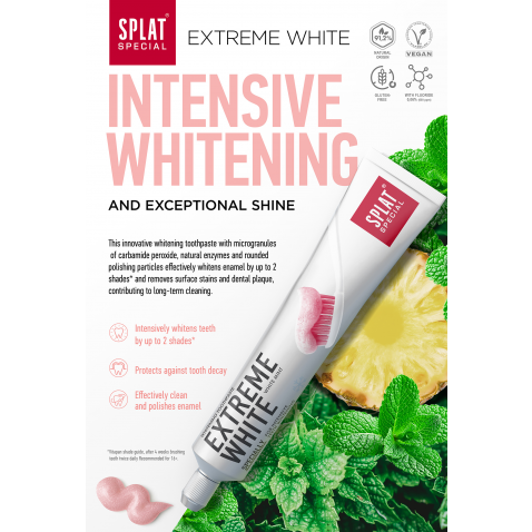 SPLAT SPECIAL EXTREME WHITE TOOTHPASTE – speciellt för intensiv tandblekning. Innehåller mikrogranulat med karbamidperoxid, som intensivt bleker emaljen upp till 2 nyanser på bara 4 veckor vid daglig användning. Naturligt ananasenzym (bromelain) och rundade polerande partiklar av kiseldioxid hjälper till att ta bort ytliga fläckar och tandplack. Polydon (PVP), en filmbildande komponent, täcker tänderna med en skyddande film som effektivt bidrar till långvarig rengöring och ger höga rengöringsegenskaper, särskilt när det gäller plack från tobak, te och kaffe. Fluoridjoner och dikalciumfosfatdihydrat skyddar mot karies. Rekommenderas för användning från 16 års ålder.